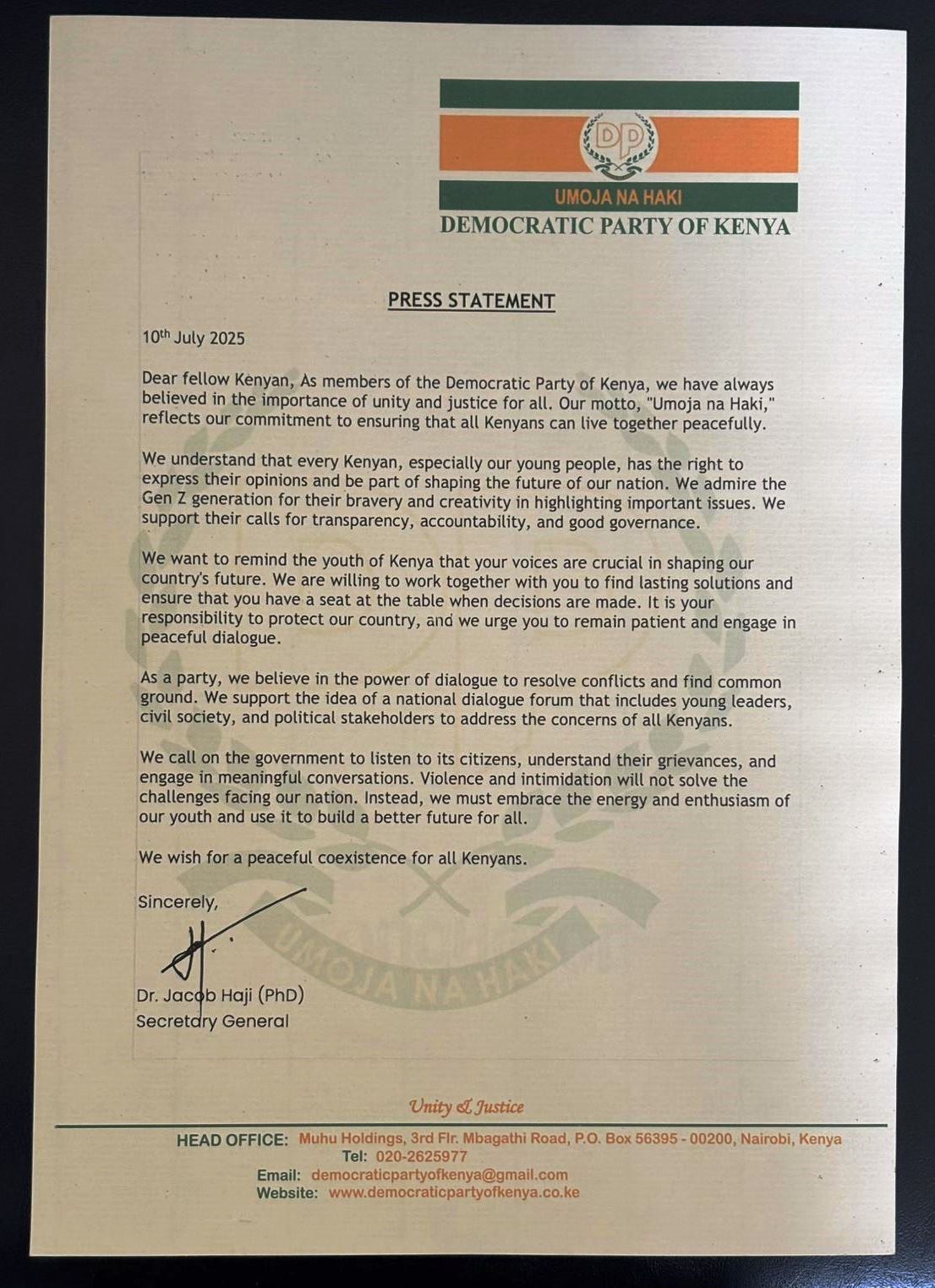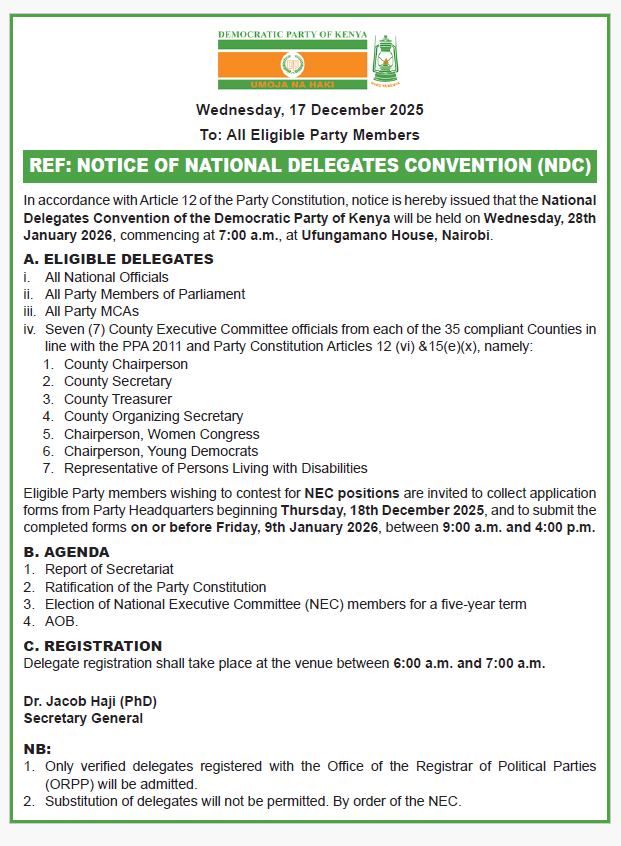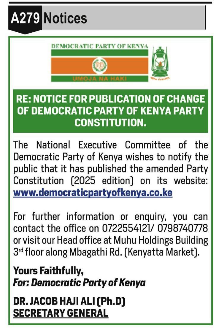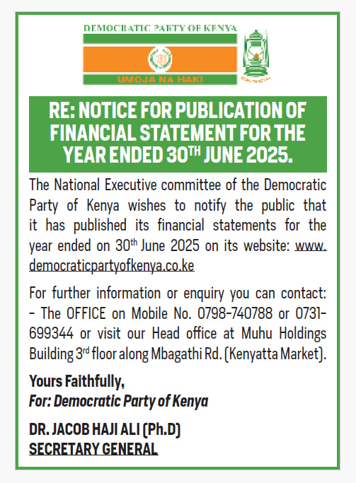 Notice For Publication of Financial Statement for the Year ended 30th June 2025 Click Here To Download the Financial Statement Post Views: 397 By admin|2025-08-28T07:28:18+00:00August 28th, 2025|News| Share This Post With Others! facebooktwitterlinkedinwhatsapppinterestEmail Related Posts Notice of National Delegates Conference December 18th, 2025 | 0 Comments Hon. Newton Kariuki (Karish)presented with his DP nomination certificate September 23rd, 2025 | 0 Comments Notice For Publication of Change of Democratic Party of Kenya Party Constitution August 8th, 2025 | 0 Comments 10th July 2025 – Press Statement July 10th, 2025 | 0 Comments